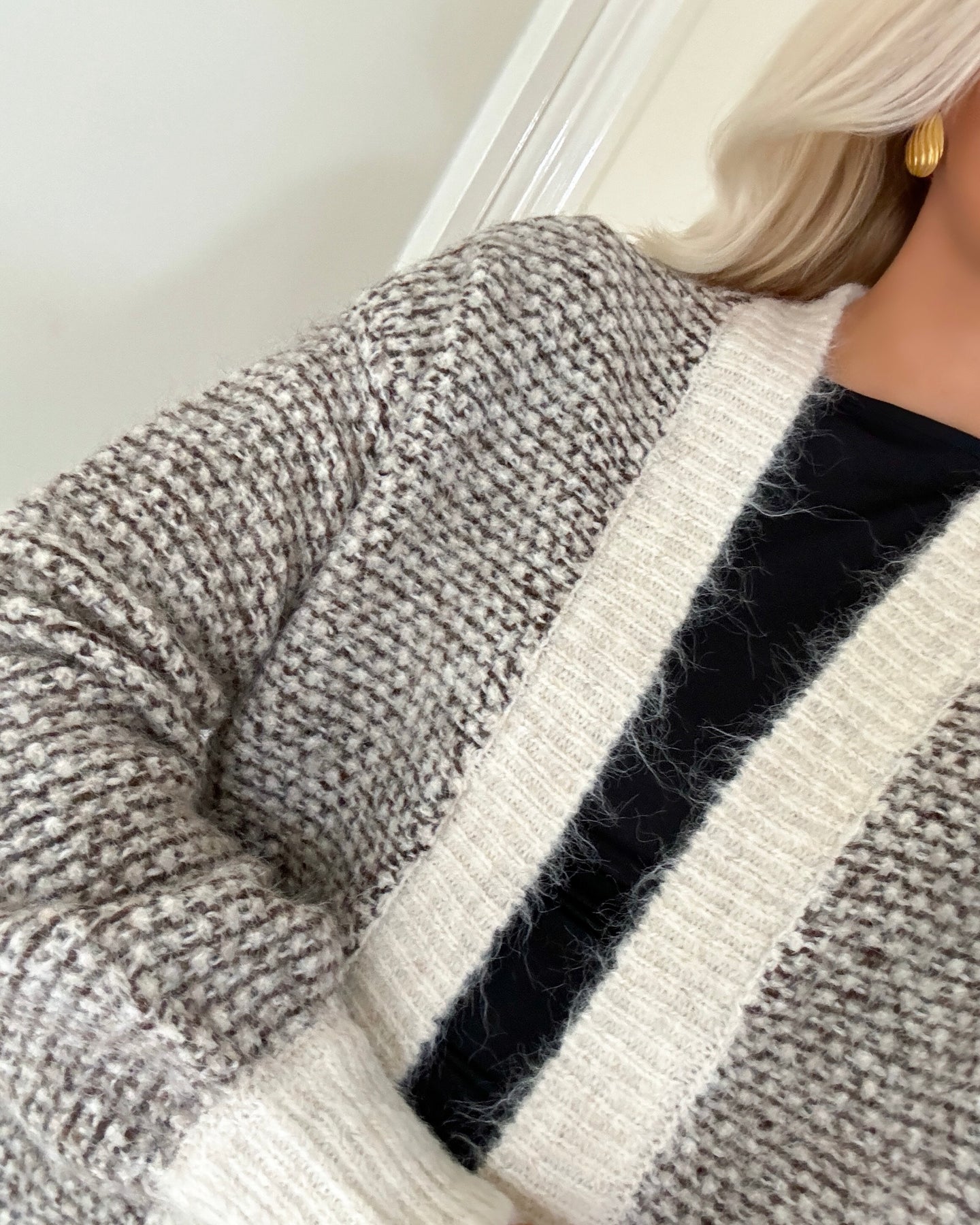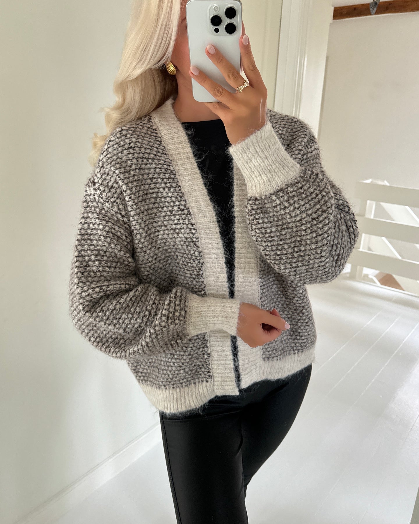 Blød cardigan i en lækker beige og brun farve med råhvide rib.