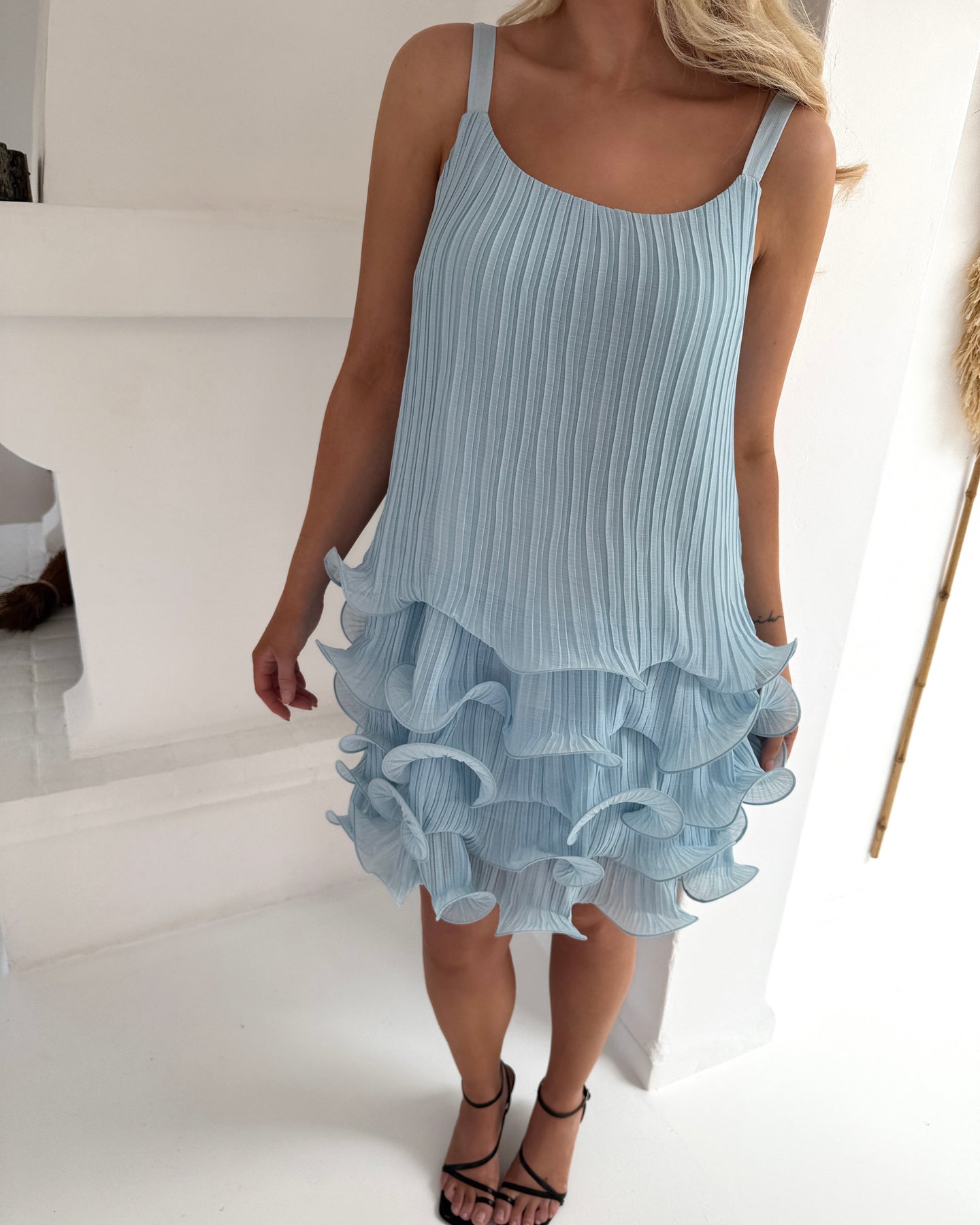 Skøn kjole i en fin lyseblå farve med flæse-detaljer.