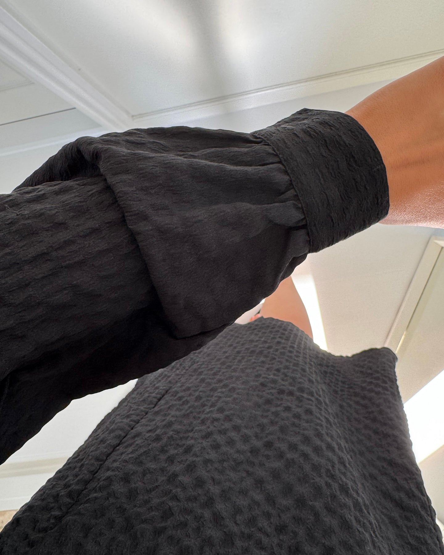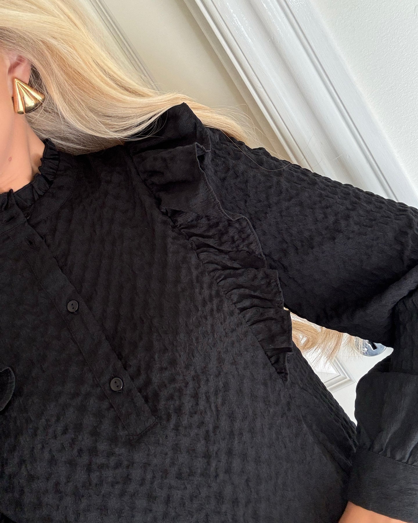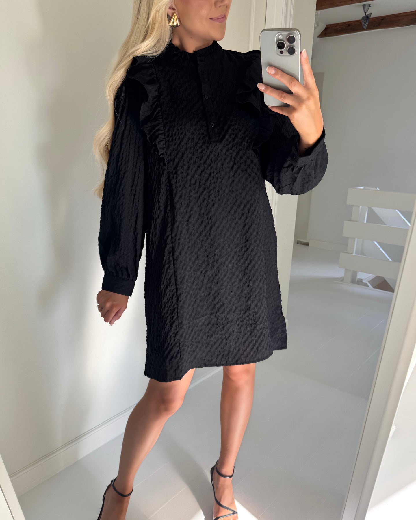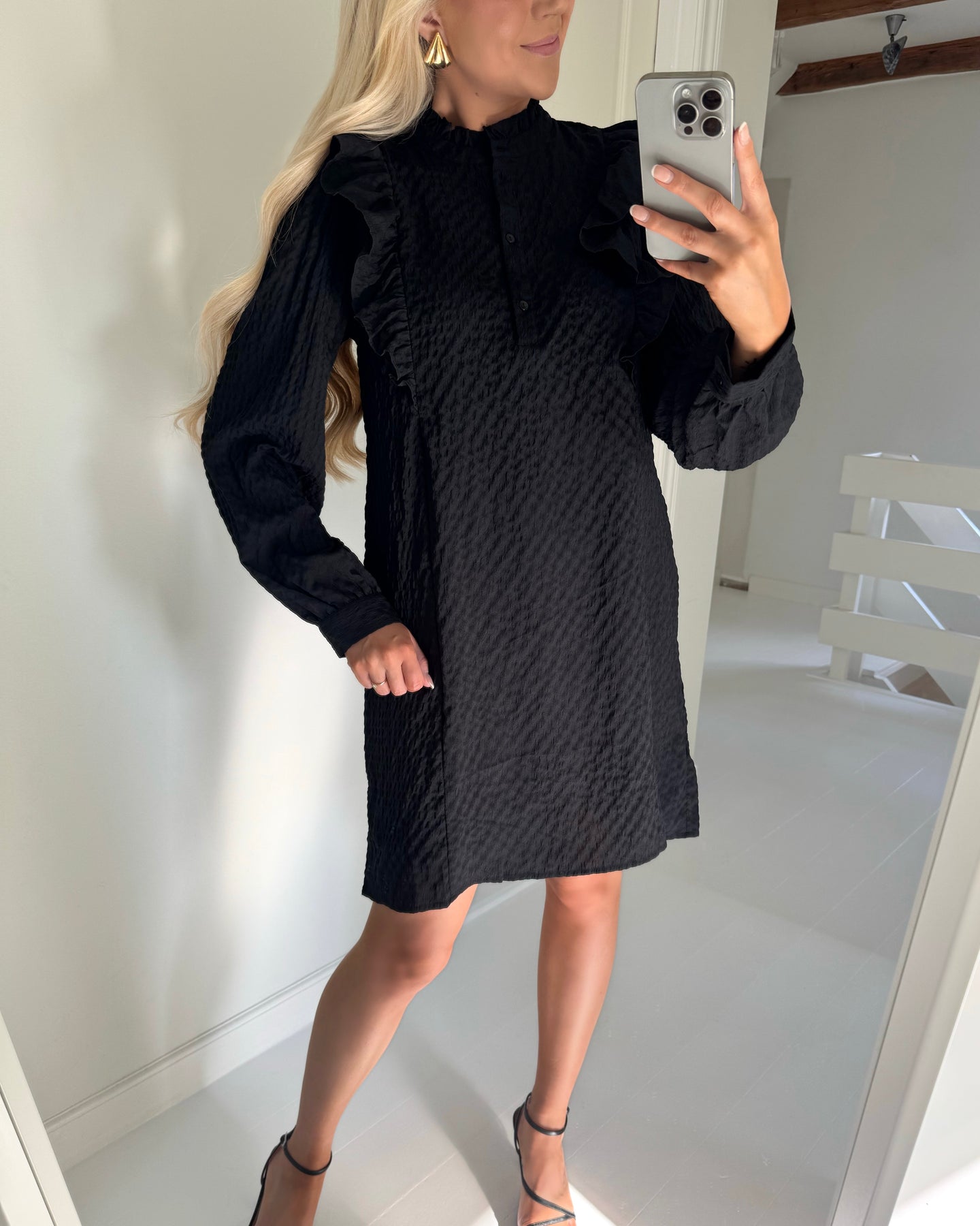 Kjole i klassisk sort med struktur i stoffet og fine flæsedetaljer.