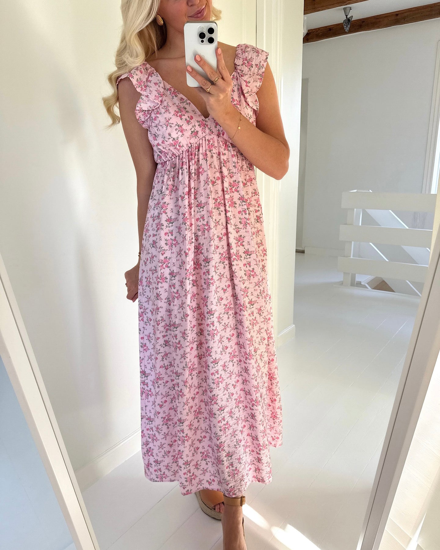 Lang kjole i en fin rosa farve med det sødeste blomstermønster.