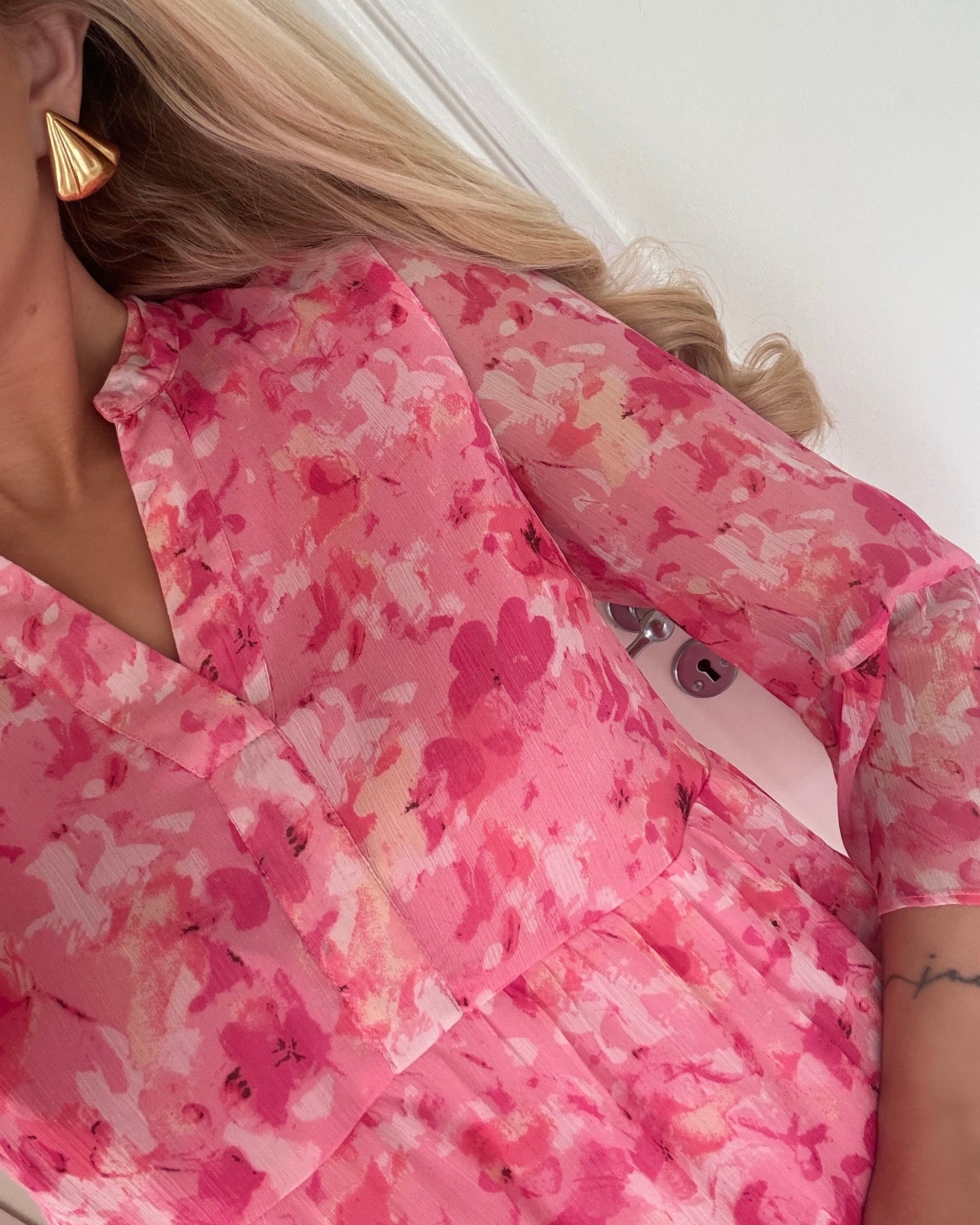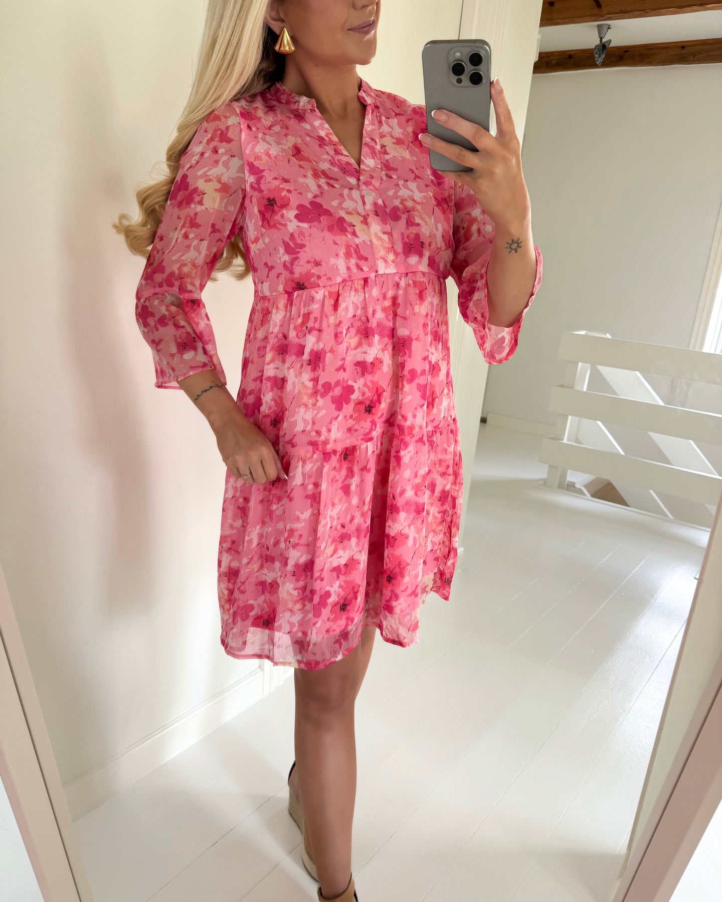 Fin kjole i en sød lyserød farve med lyserøde blomster.