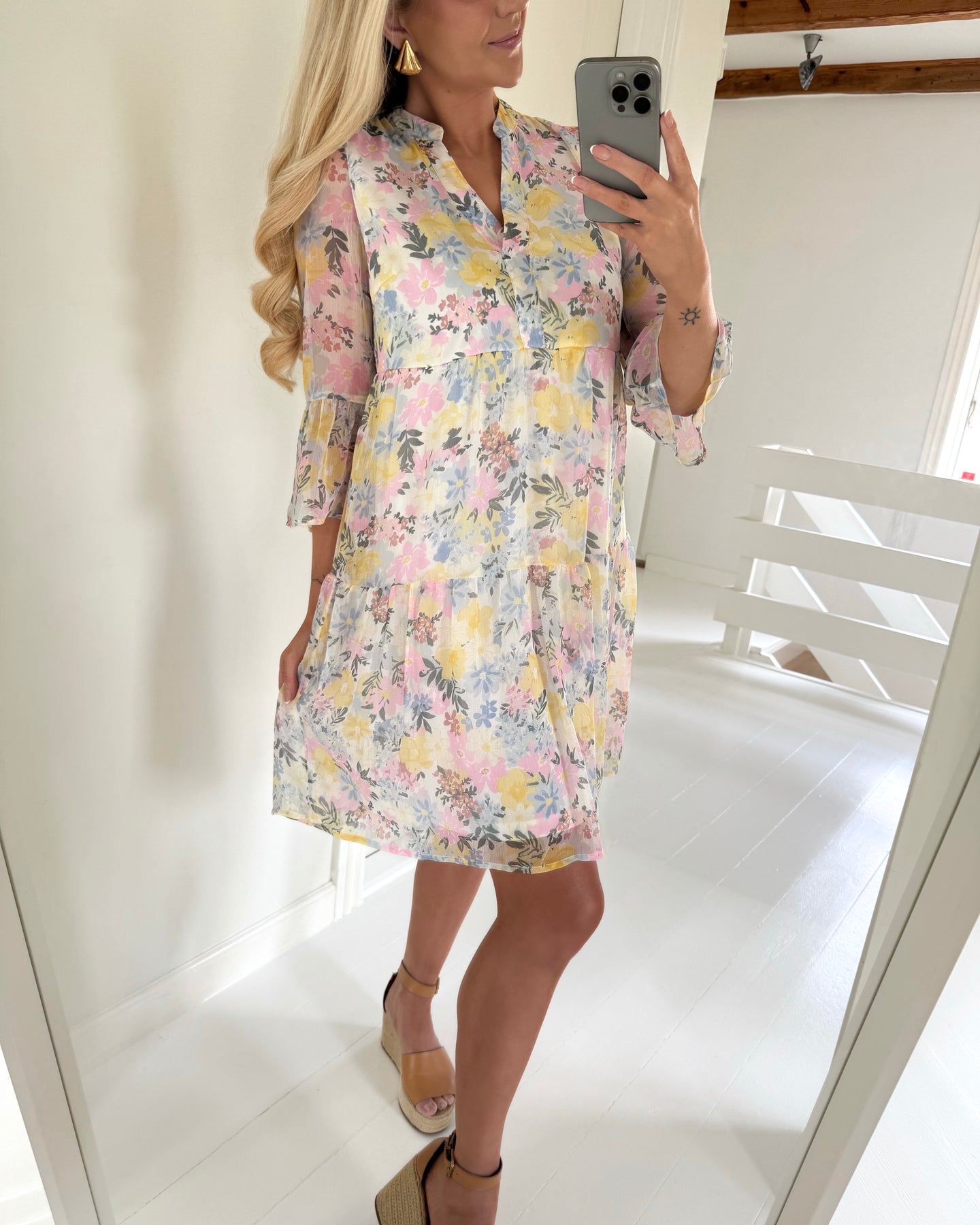 Fin kjole med flerfarvet blomstermønster.