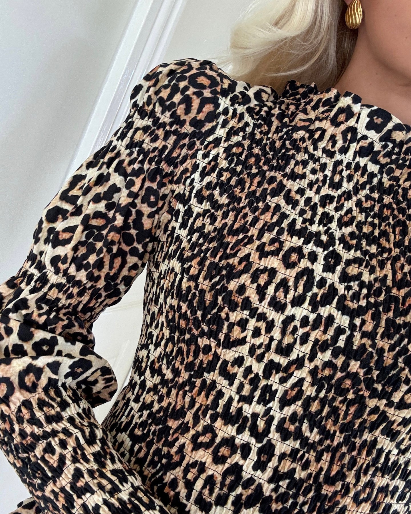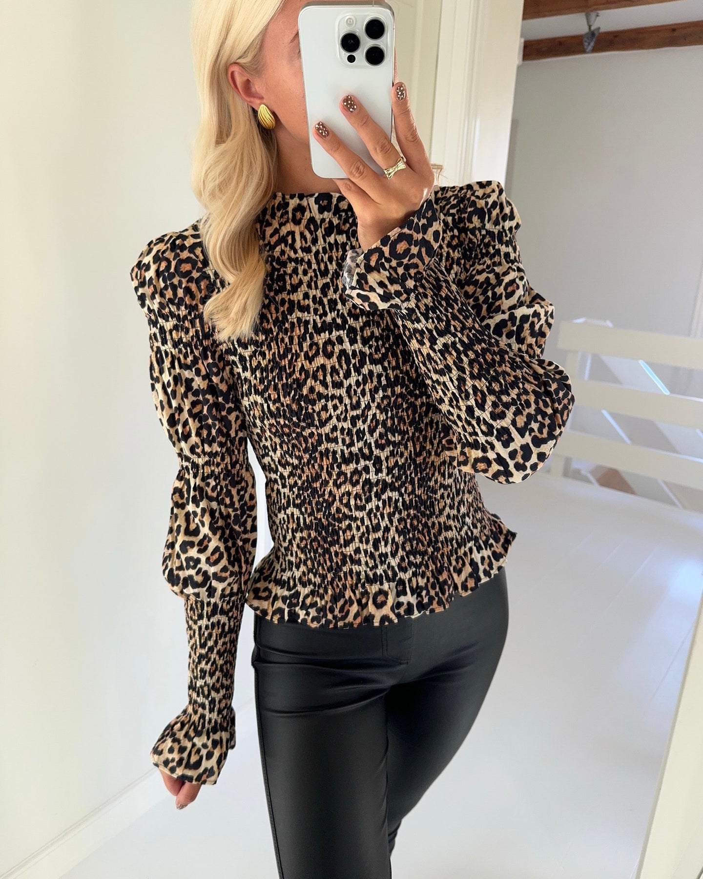 Fineste bluse i leopardprint, den har en rund hals med flæser, lange ærmer samt feminint smock.