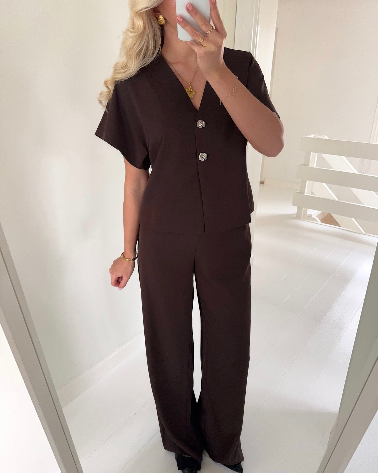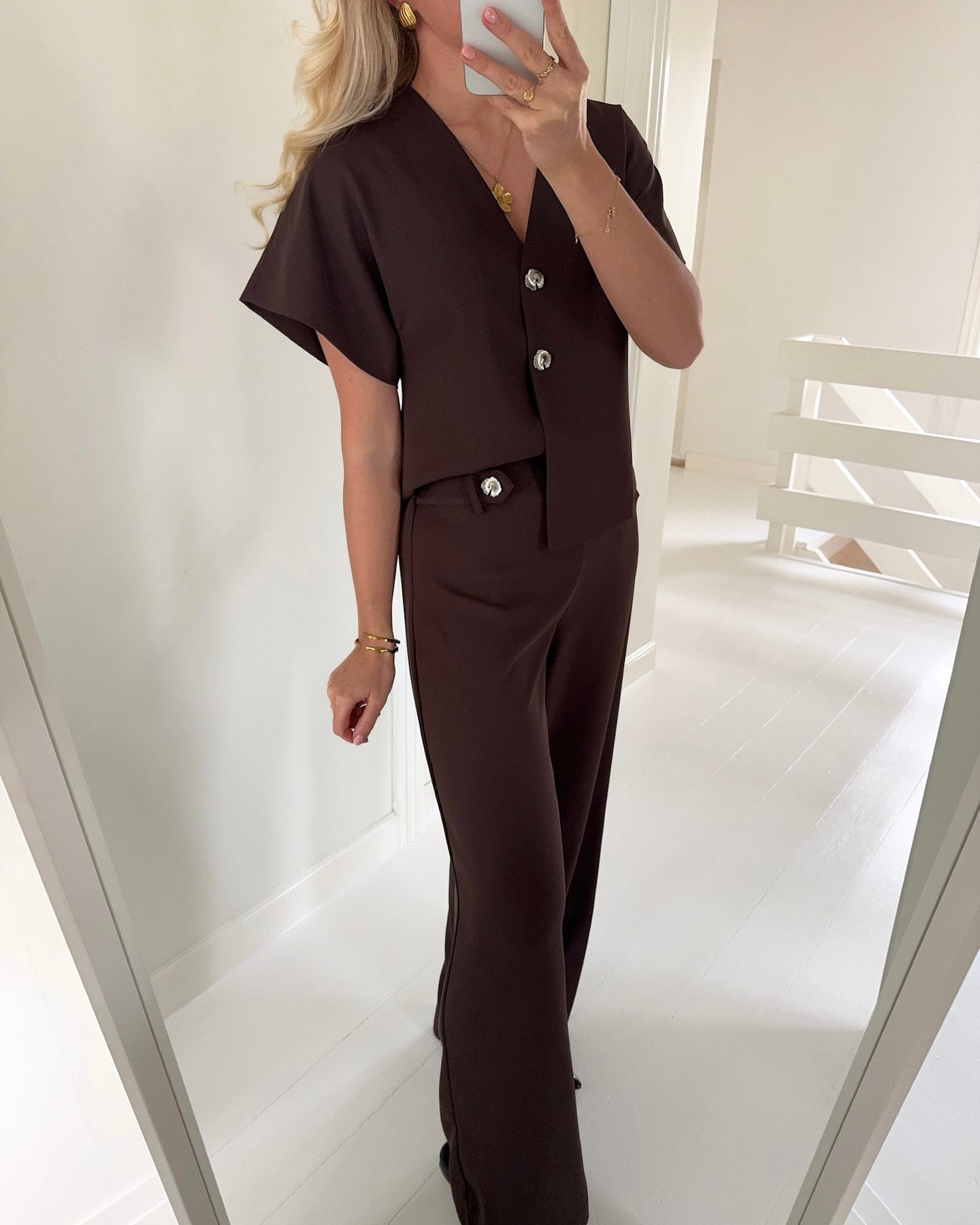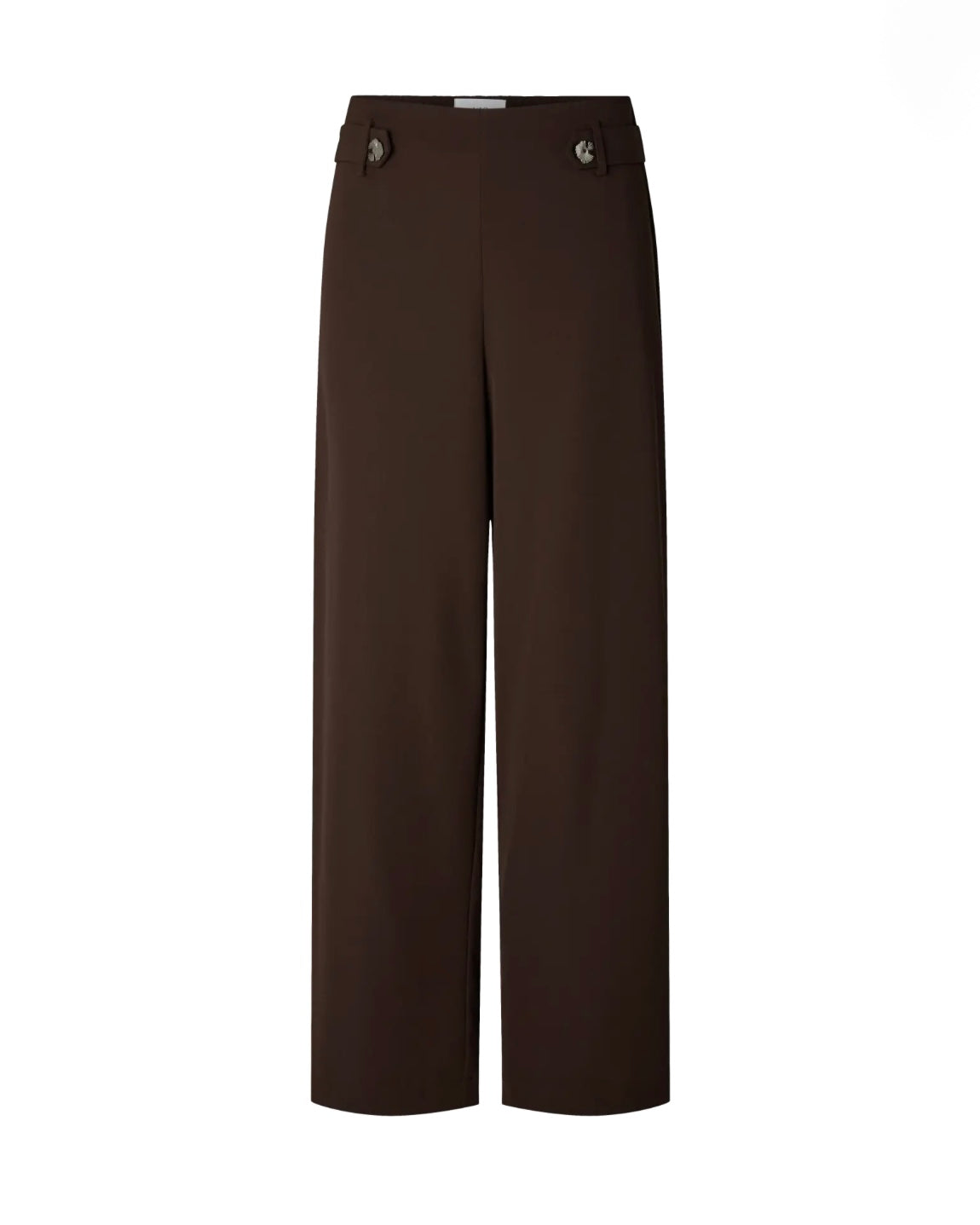 Højtaljede brune bukser med eksklusive sølv knapper ved taljen og en skøn rummelig pasform.