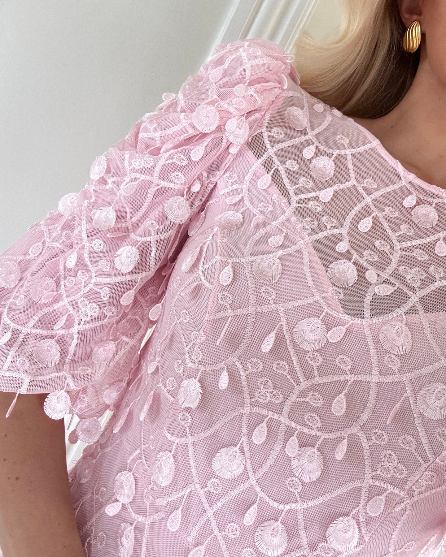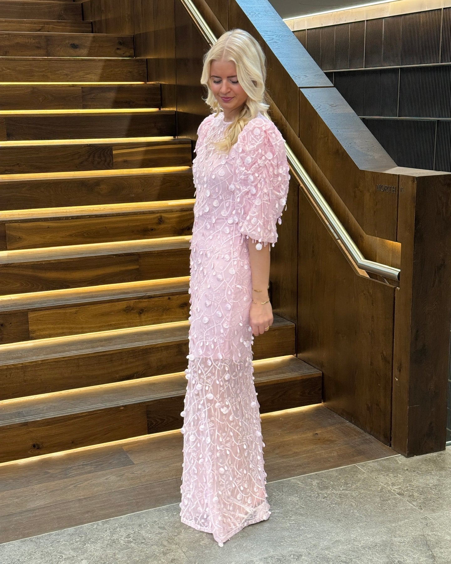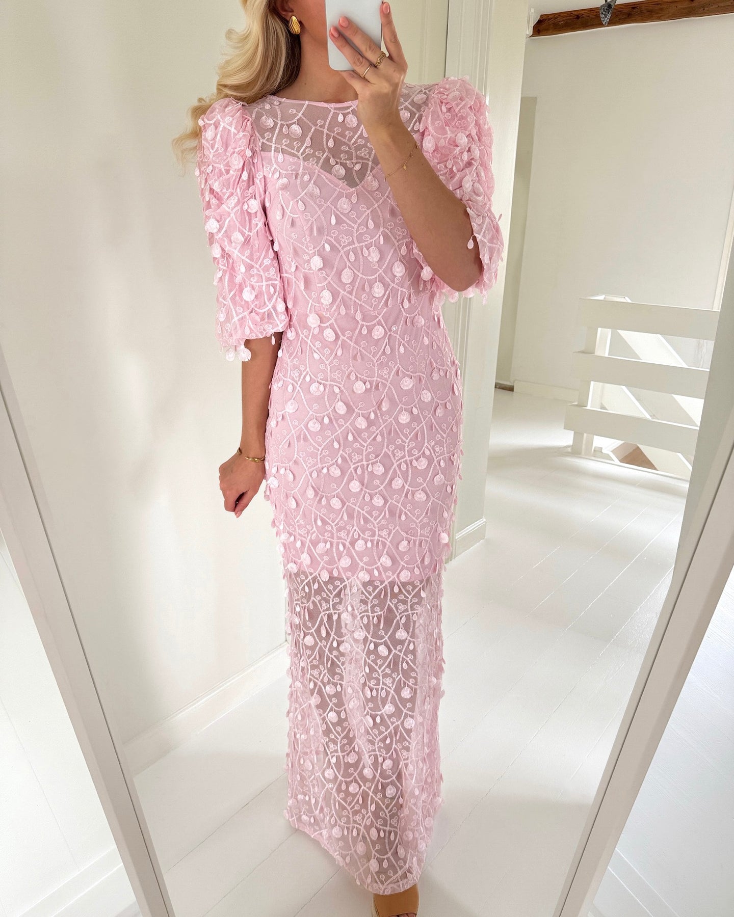 Skøn lang kjole i en fin lyserød farve med eksklusive påsatte detaljer.