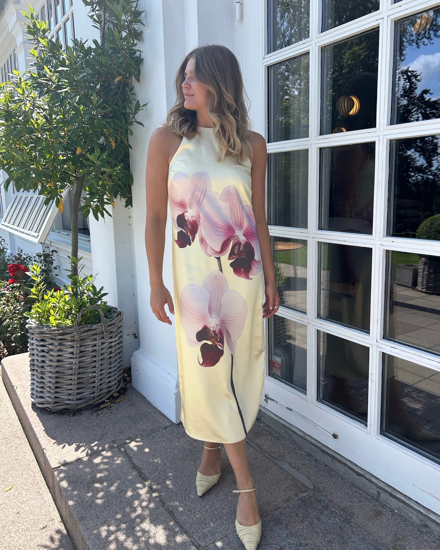 Skøn kjole i en lysegul farve med en stor orkide-blomst foran.