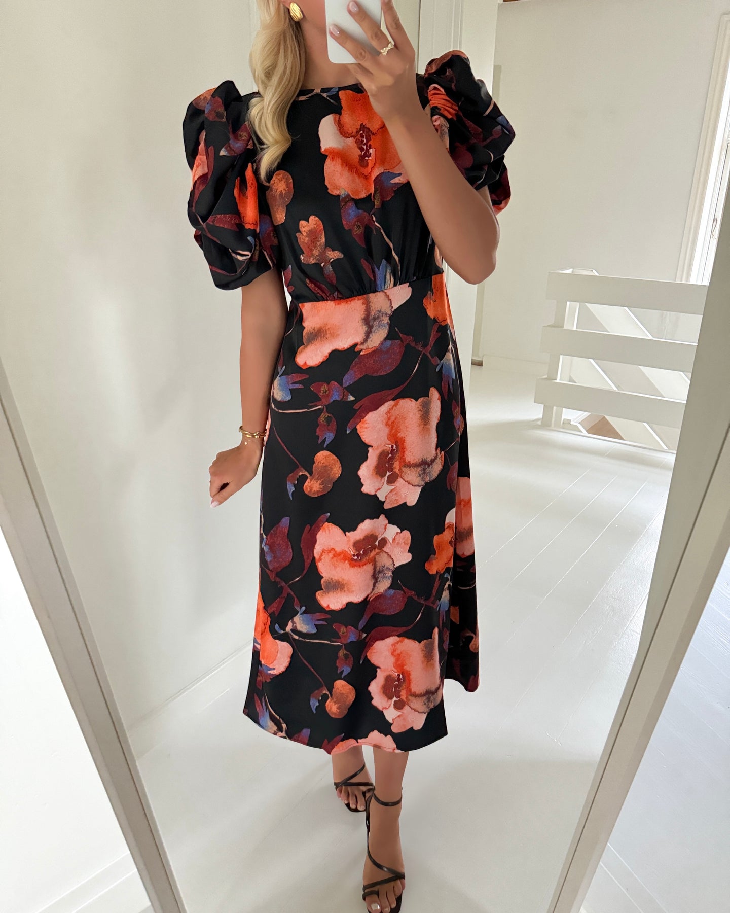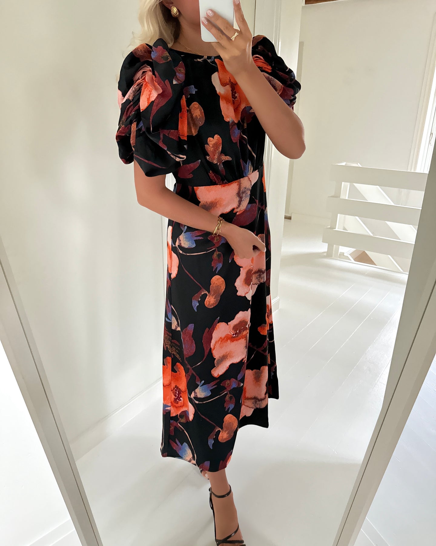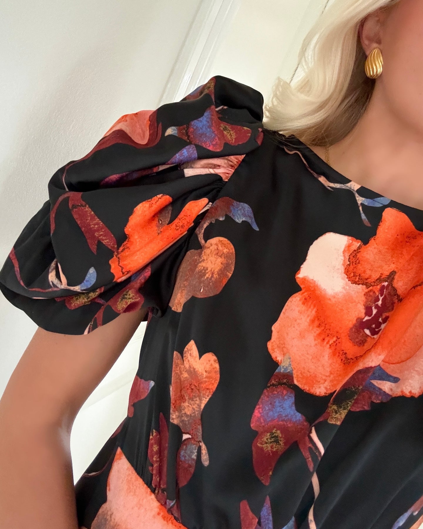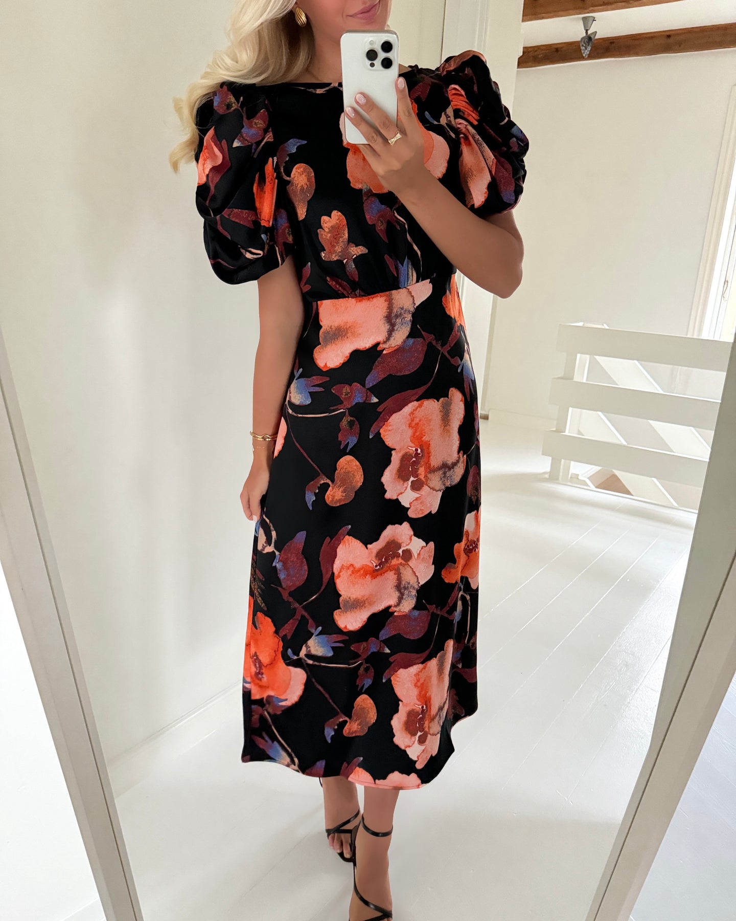 Smukkeste lange kjole i en klassisk sort farve med smukt blomster design i varme farver.