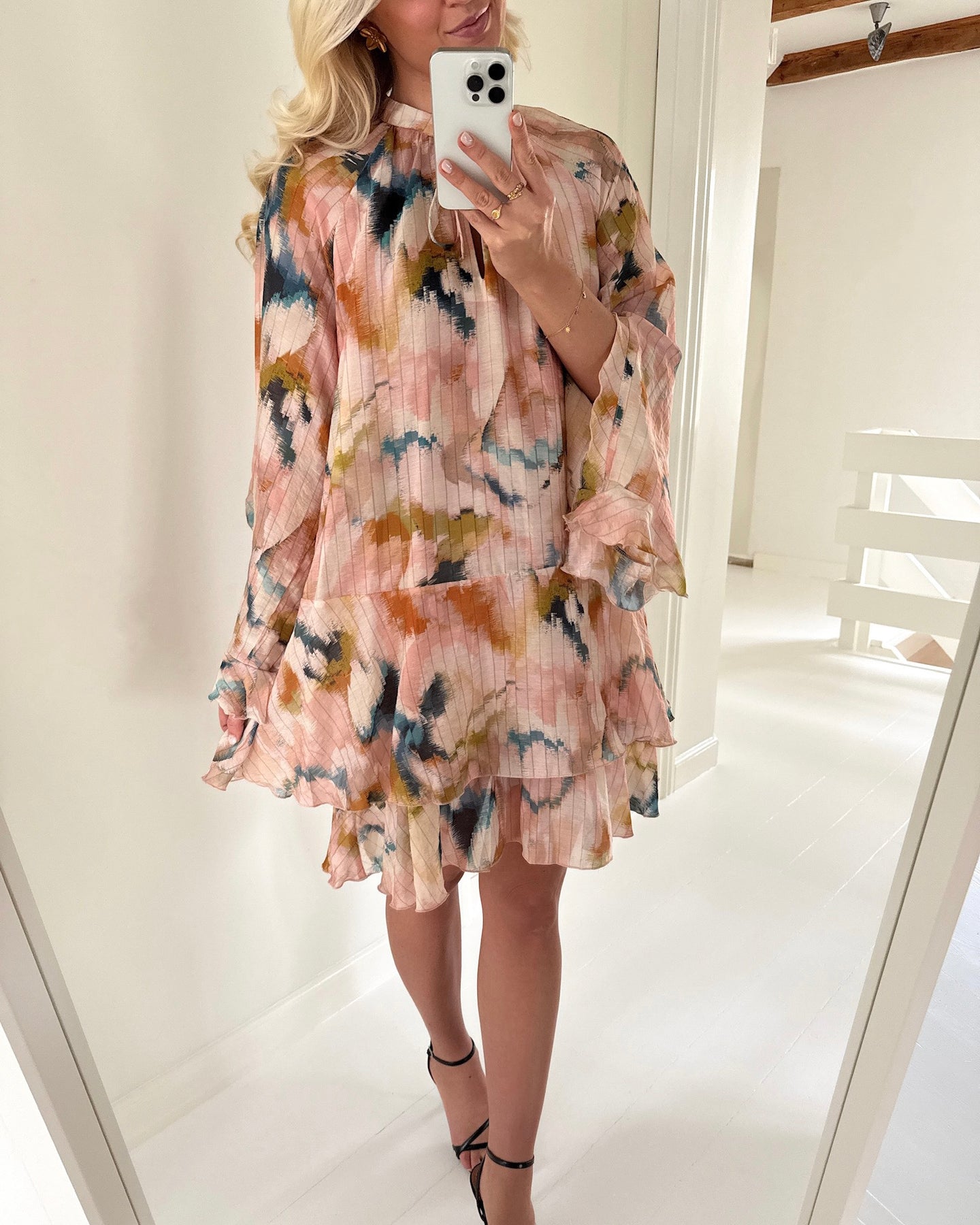 Kjolen er kort og har det fineste print i de smukkeste farver. Derudover har den de flotteste flæse detaljer og lange ærmer.