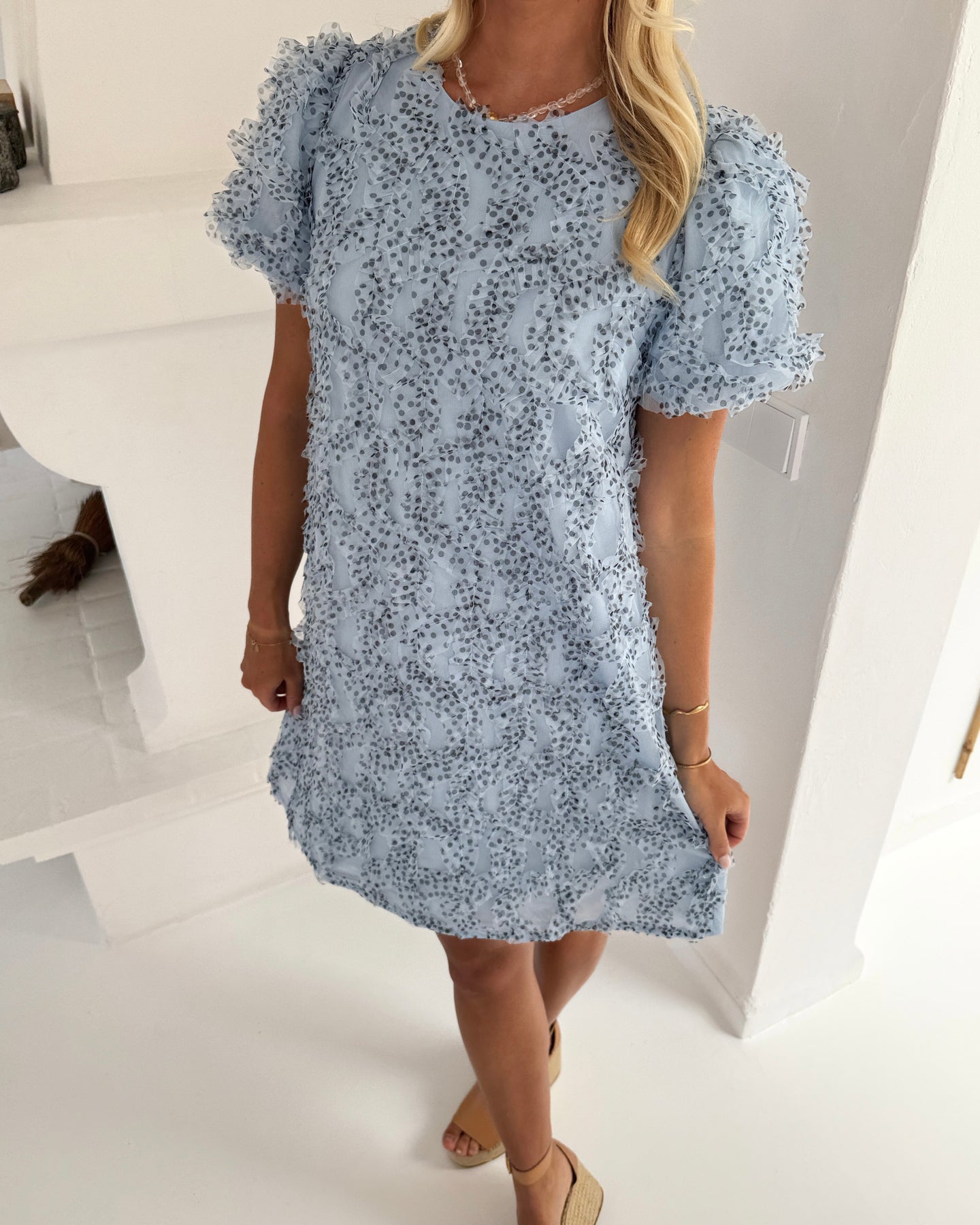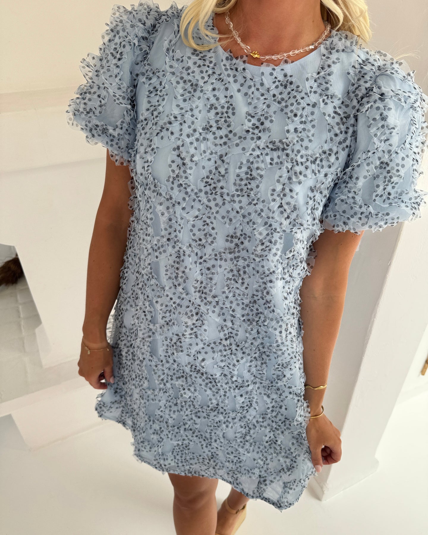 Skøn kjole i en fin lyseblå farve med sorte prikker.