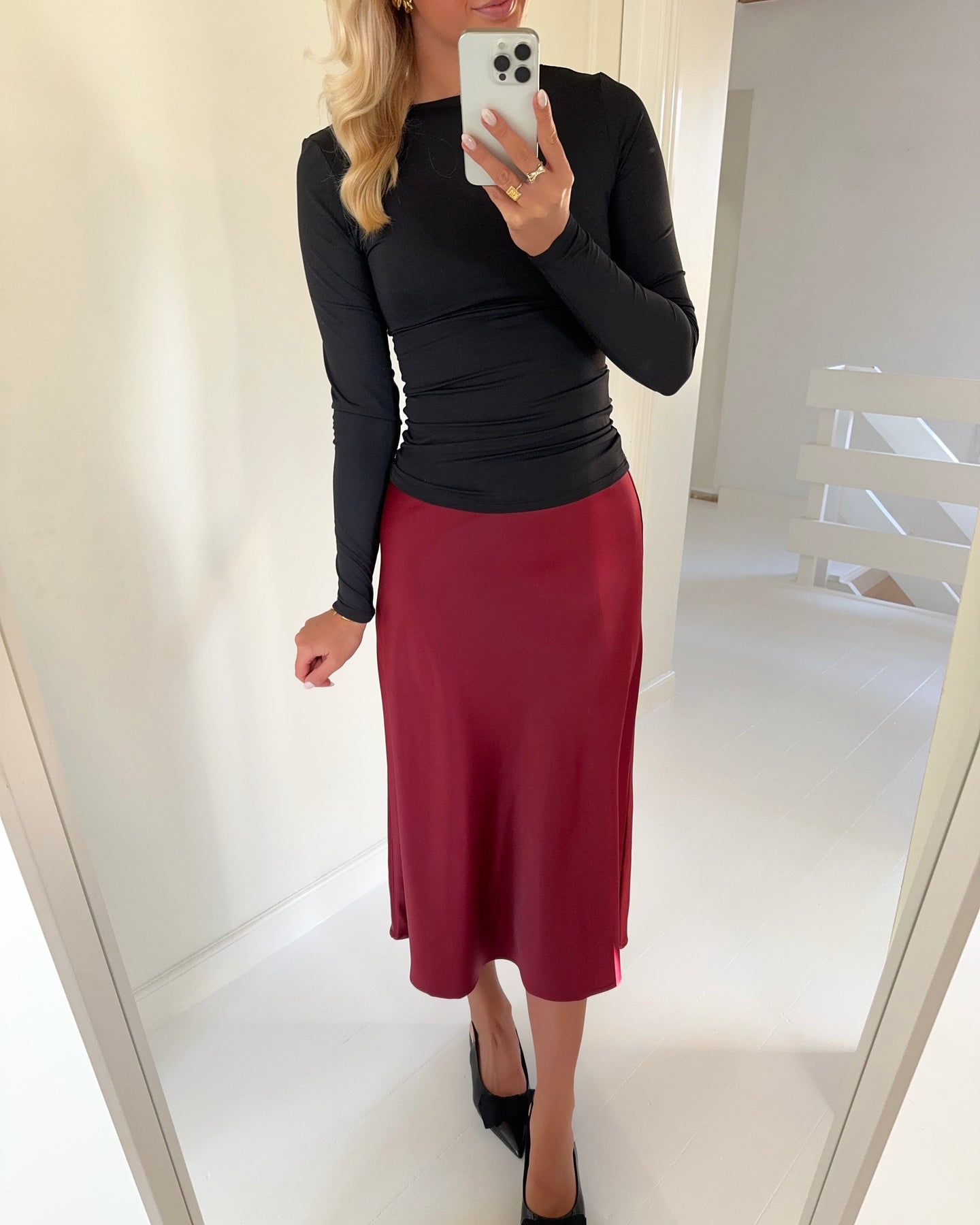 Elegant nederdel i klassisk bordeaux farve i silkelook.